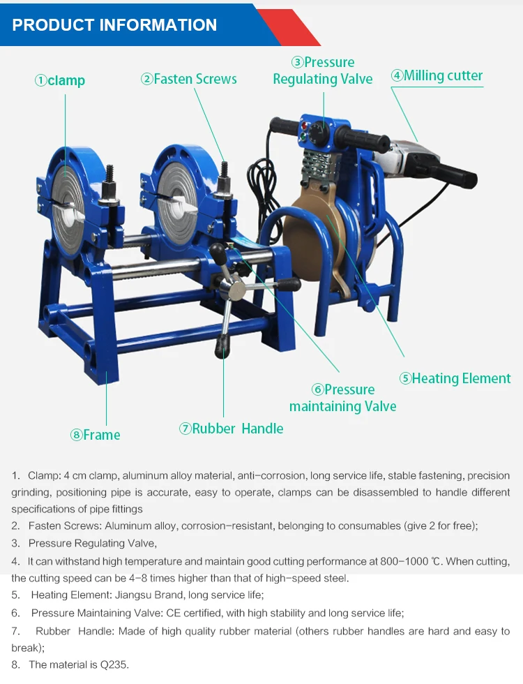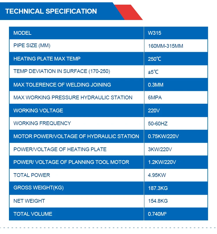 | Welding range: | 40mm-50mm-63mm-75mm-90mm-110mm-125mm-140mm-160mm-1000MM; |