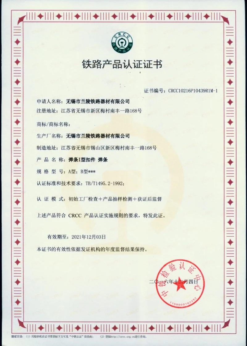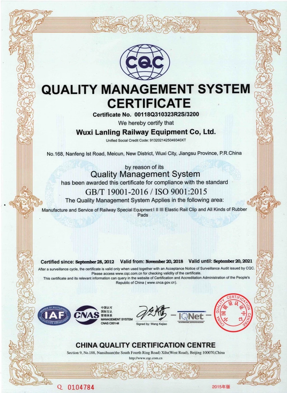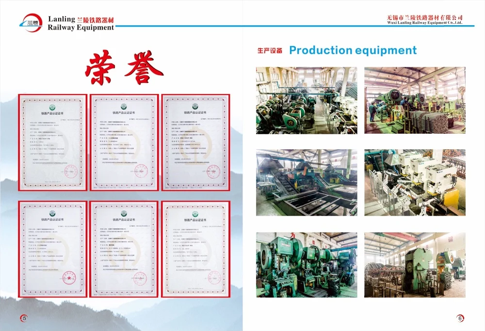 Wuxi Lanling Railway Equipment Co., Ltd. is one of the leading manufacturers of railway material and railway fasteners. We have the manufacture factory by ourselves. Our products have been exported worldwide, We have gained ISO9001-2015 certificate and also got the CRCC awarded by China railway Ministry on railway. We can produce according to International standards like ASTM, DIN, BS, JIS, NF, ISO. We can also provide OEM service and develop the new products if you can provide us the drawings or samples.