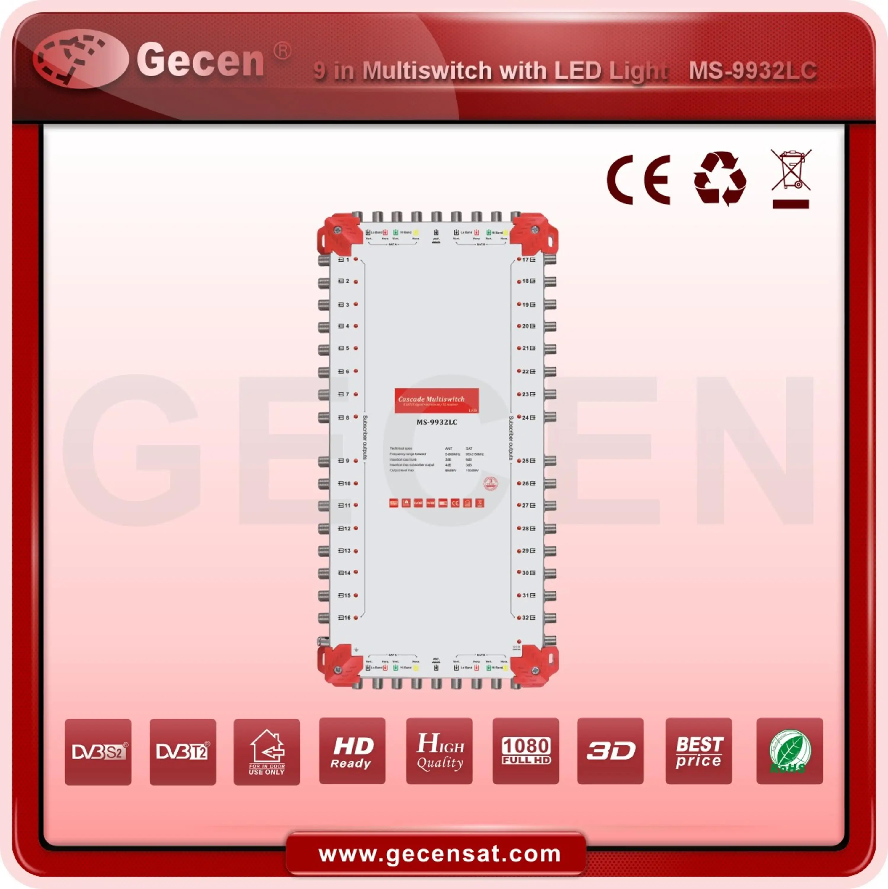 9X9X32 Cascade Satellite Multiswitch with LED 9 inputs 32 outputs MS-9932LC