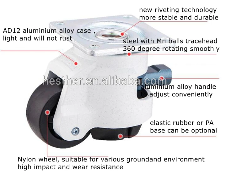 | Material: | Aluminium alloy housing+PA wheel + steel fitting+PA cushion; | Product name: | richet leveling adjustable caster; |