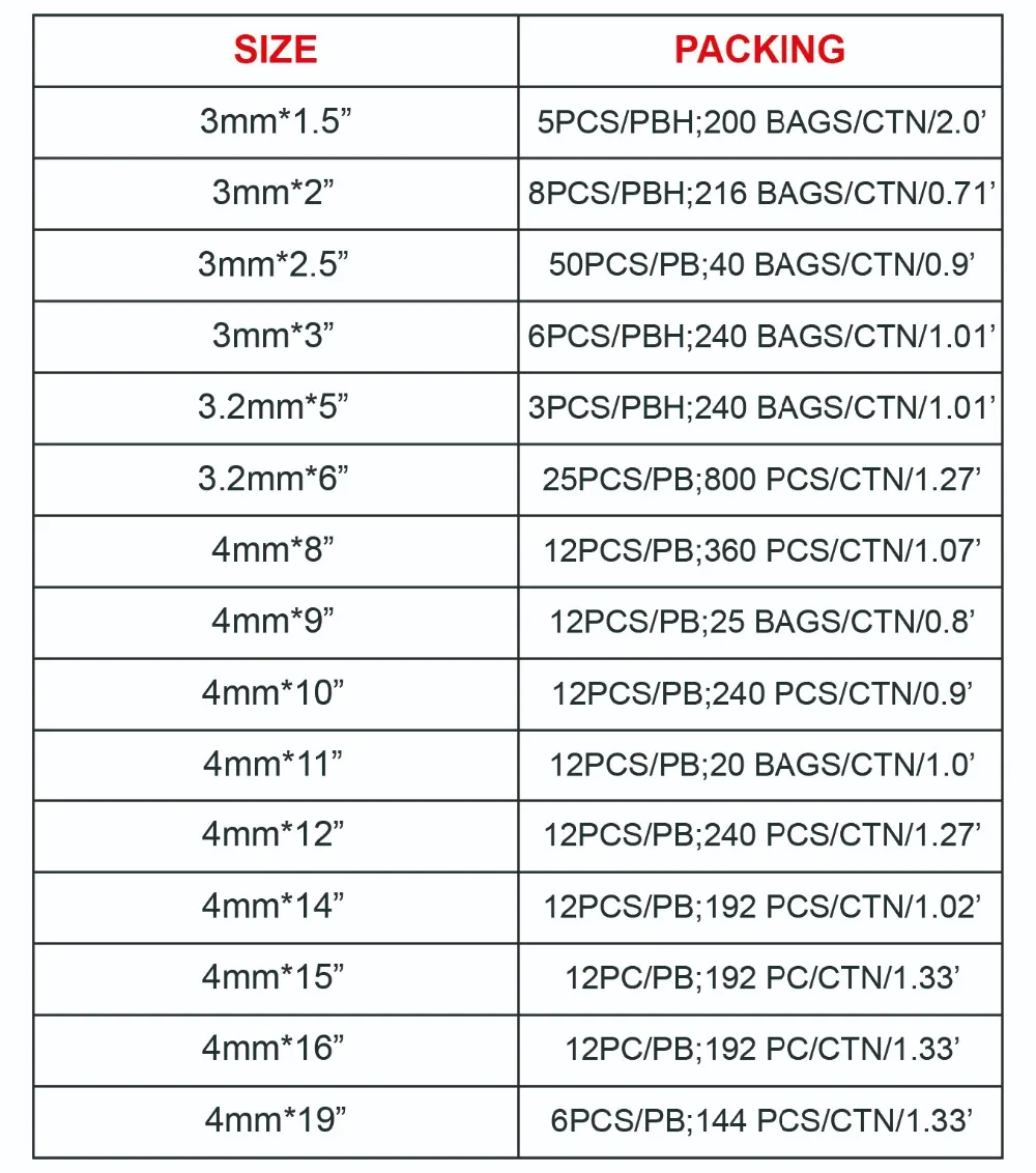 | Supply Ability: | 20000 Piece/Pieces per Month; | Packaging Detail: | 3mm*1.5" -5PCS/PBH; 200 BAGS/CTN 3mm*2" -8PCS/PBH; 216BAGS/CTN 3mm*2.5" -50PCS/PB; 40BAGS/CTN 3mm*3" -6PCS/PBH; 240BAGS/CTN 3.2mm*5" -3PCS/PBH; 240BAGS/CTN 3.2mm*6" -25PCS/PB; 800PCS/CTN 4mm*8" -12PCS/PB; 360PCS/CTN 4mm*9" -12PCS/PB; 25BAGS/CTN 4mm*10" -12PCS/PB; 240PCS/CTN 4mm*11" -12PCS/PB; 20BAG/CTN 4mm*12" -12PCS/PB; 240PCS/CTN 4mm*14" -12PCS/PB; 192PCS/CTN 4mm*15" -12PC/PB; 192PC/CTN 4mm*16" -12PC/PB; 192PC/CTN 4mm*19" -6PCS/PB; 144PCS/CTN; |
