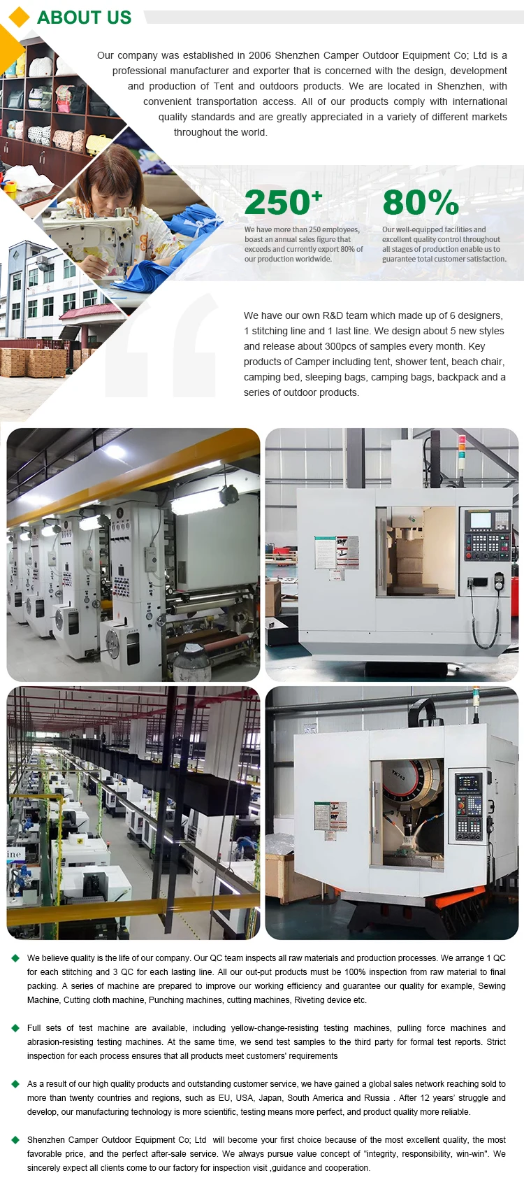 Keyproducts of Camper including tent , shower tent , beach chaircamping bed , sleeping bags , camping bags , backpack and asenes of outdoor products.