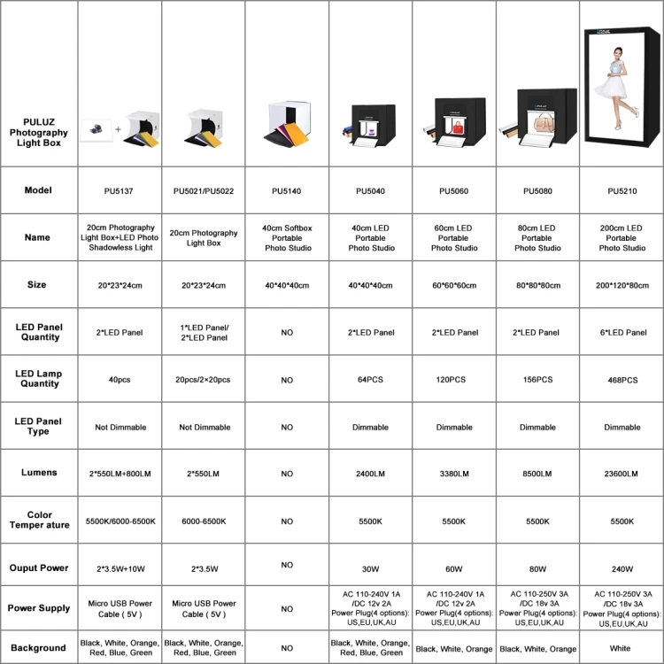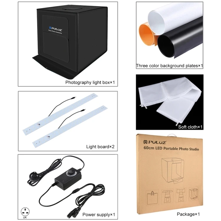 | Package Include | | Package Contents | 1 x Main Studio Box 1 x Black backdrops 1 x White backdrops 1 x Orange backdrops 2 x Light Board 1 x Soft Cloth 1 x UK Plug Power Supply |