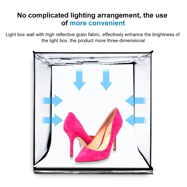 3. 2 LED strip: Built in 2 high quality LED strips, photography studio helps you to take premium photos, 60W 5500K LED lights can soften and reflect lights, eliminate glare and spots for a perfect shooting, you can adjust the brightness by the power supply according to the different items you shoot.
