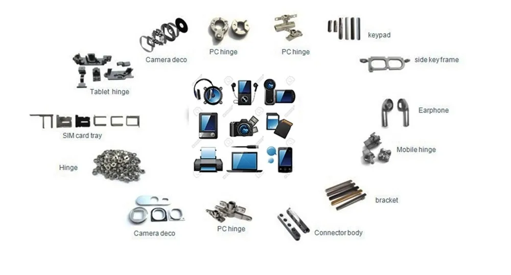 PC, notebooks, cell phones, headsets, earphones and other electronic devices reach a premium quality impression if they are equipped with metal parts in high grades surface conditions made by MIM. Futhermore the endurance of those devices can considerably be extend if i.e. plastic keys are replaced by metal parts.