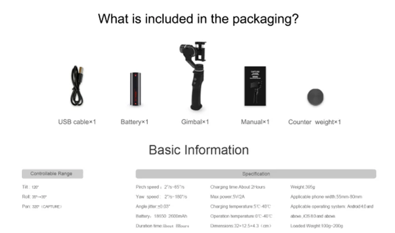 | Product name: | 3 axis gimbal; | Weight: | 395 g; |