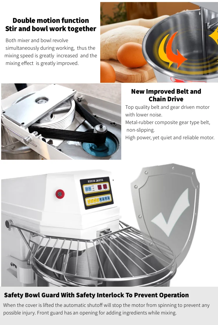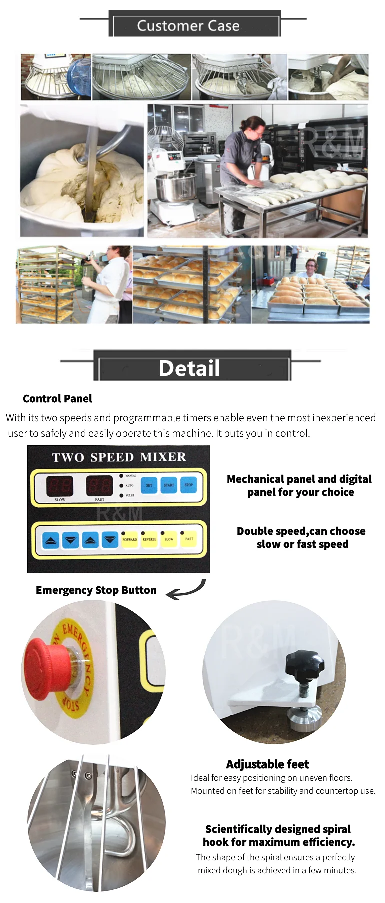 R&M Spiral mixers can imitate hand-kneading and rolling motions.The process of mixing with a spiral hook incorporates the more than double the amountof air into the dough, giving you a light and airy product simulating kneading the dough by hand.