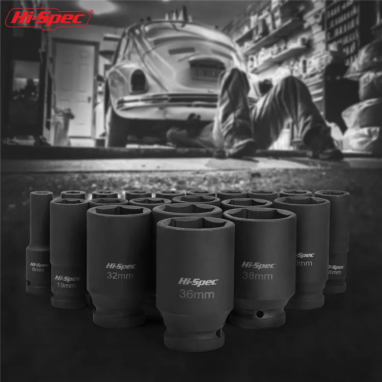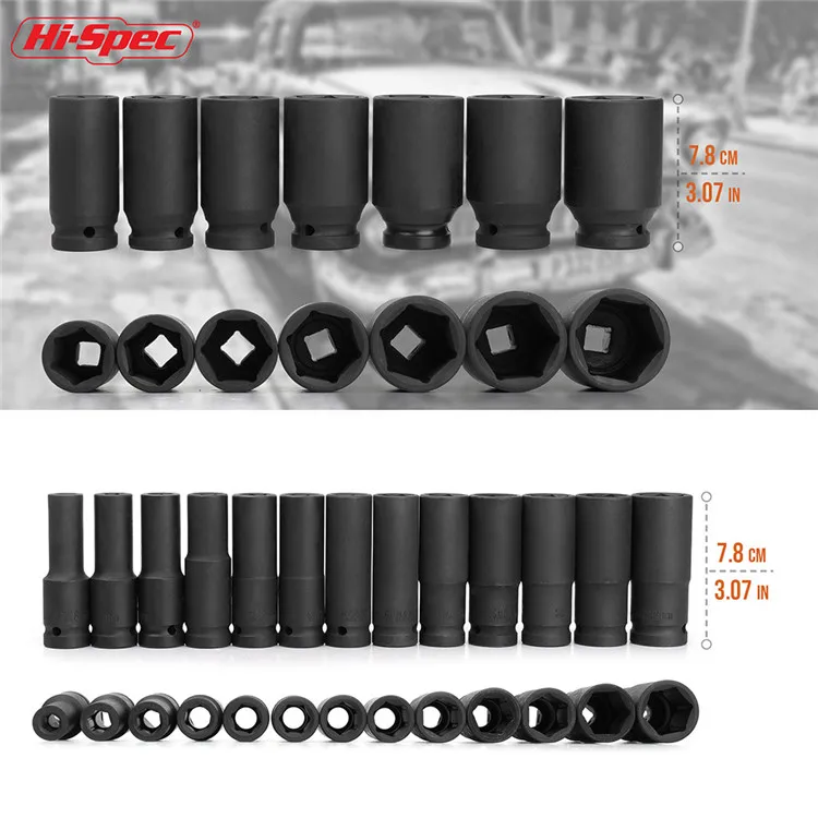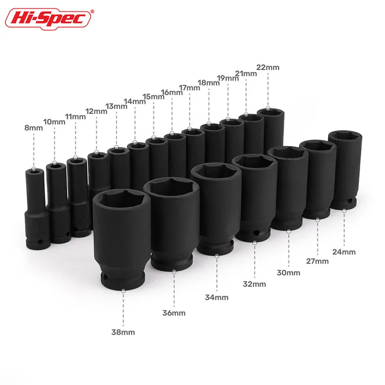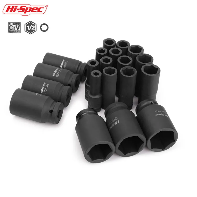 ♦ Technical Data 1/2" Impact Deep Sockets: 8-10-11-12-13-14-15-16-17-18-19-21-22-24-27-30-32-34-36-38 Material: Chrome Vanadium Steel **Price and sample price above is only for one size. If need to buy more sizes or one full set, please contact seller to re-calculate the cost. Thank you.