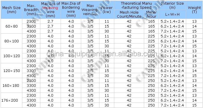 | 1.Mesh Size’s range from 50*70 mm To 176*200 mm; 2.We can design the machine to produce the mesh size according to customer’s request .But the mesh size should in the range of 50*70 mm To 176*200 mm; 3.Range of galvanized wire:2.0mm~4.0mm(for different mesh size pls find the parameter in the specification); 4.Range of PVC coating galvanized wire: ≤5.0mm; 5.Our motor adopt Frequency Motor; |