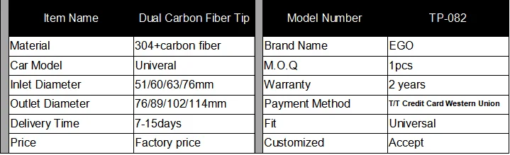 | 1.Material: 304 and Carbon Fiber 2.Strict quality control during the process 3.Professional Performance Auto parts supplier 4.Customers design and logo are welcome 5.Delivery on time and best after-sales service |