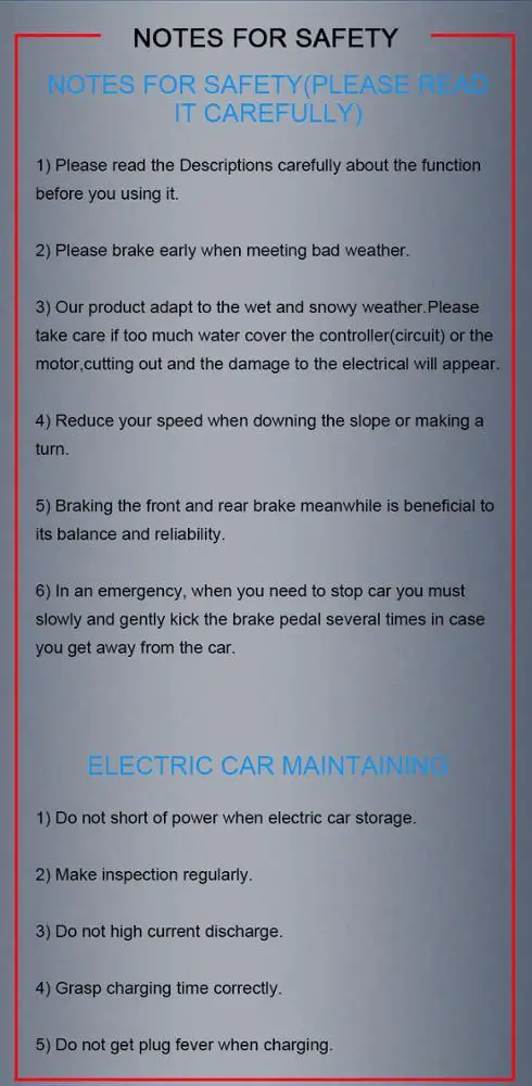 3) Our product adapt to the wet and snowy weather.Please take care if too much water cover the controller(circuit) or the motor,cutting out and the damage to the electrical will appear.