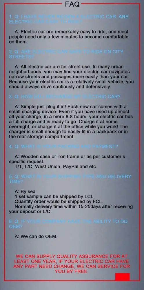 We can supply quality assurance for at least one year, if your Electric Car have any part need change, we can service for you by free.