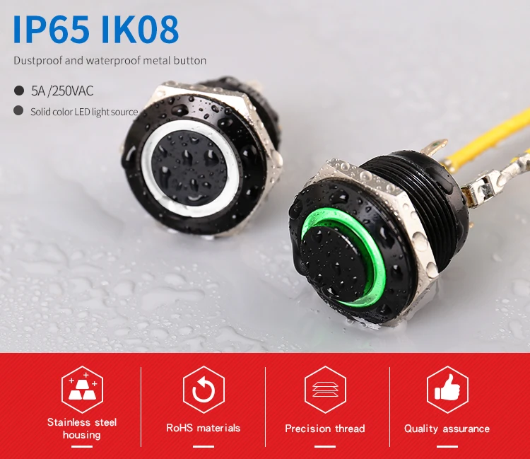 | Packaging Detail: | we put 40 pieces of 19mm metal IP65 waterproof push button switches into one box, 1: Neutral packing : plastic bag for goods+ inner box bubble+ inner box +carton 2: Carton size: 44mm*34mm*38mm 3: 50pcs/box,20boxes/carton; | Contact configuration: | 1NO; |