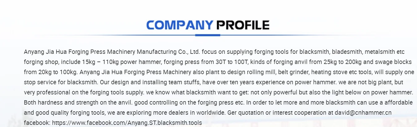 Anyang ST forging machinery factory focus on self-contained power hammer and hydraulic press for blacksmith shop. STH series power hammers include 15kg, 25kg, 40kg, 55kg, 75kg and 110kg. All of our hammers got CE certification, we have exported our machines to USA, Canada, UK, France, Norway, Australia, Philippine, Argentina etc over 30 countries.