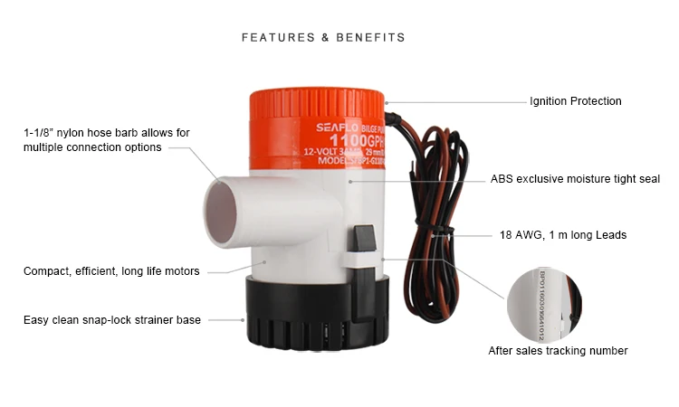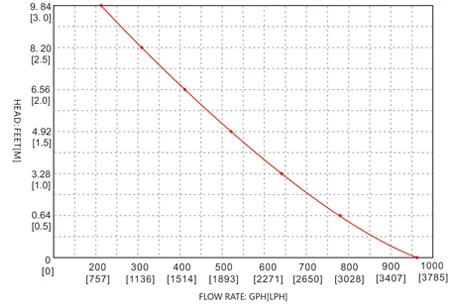 | SFBP2-G1100-01 | 1100 GPH | 24 V | 1.8 A | 3.0 A | 12' (4m) | 3' (1m) | 1-1/8" | 0.38/0.44 kg |