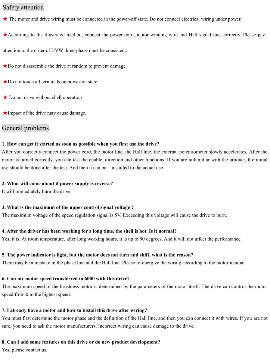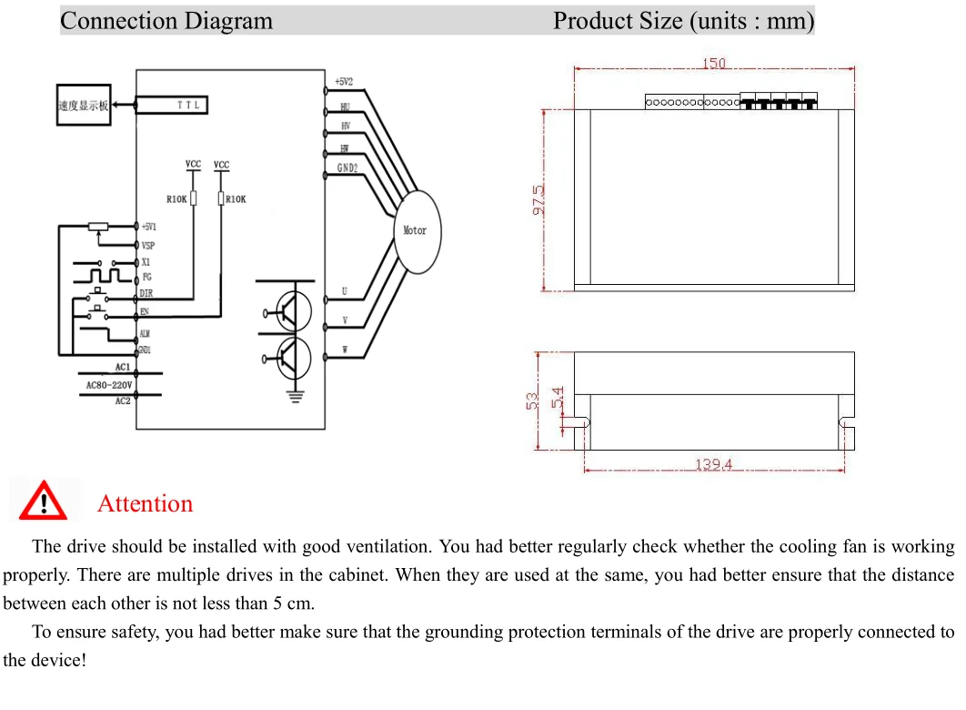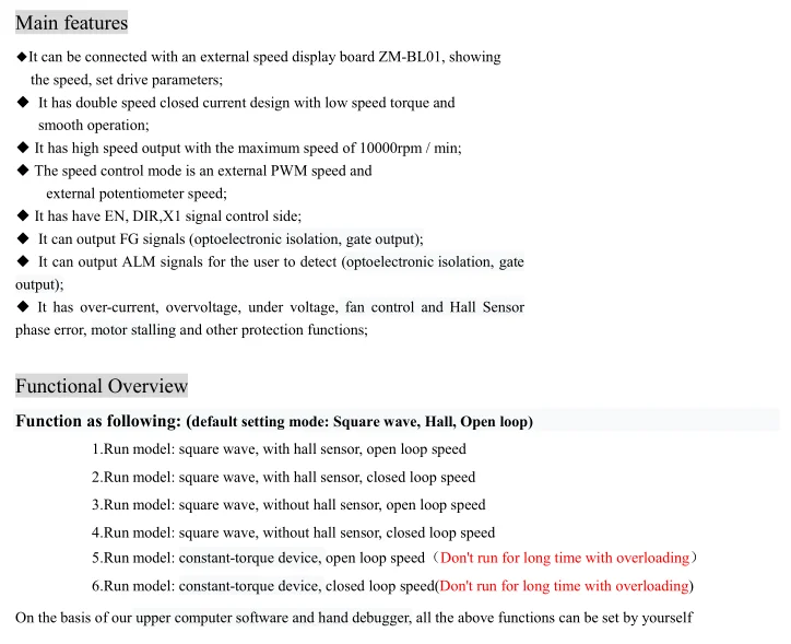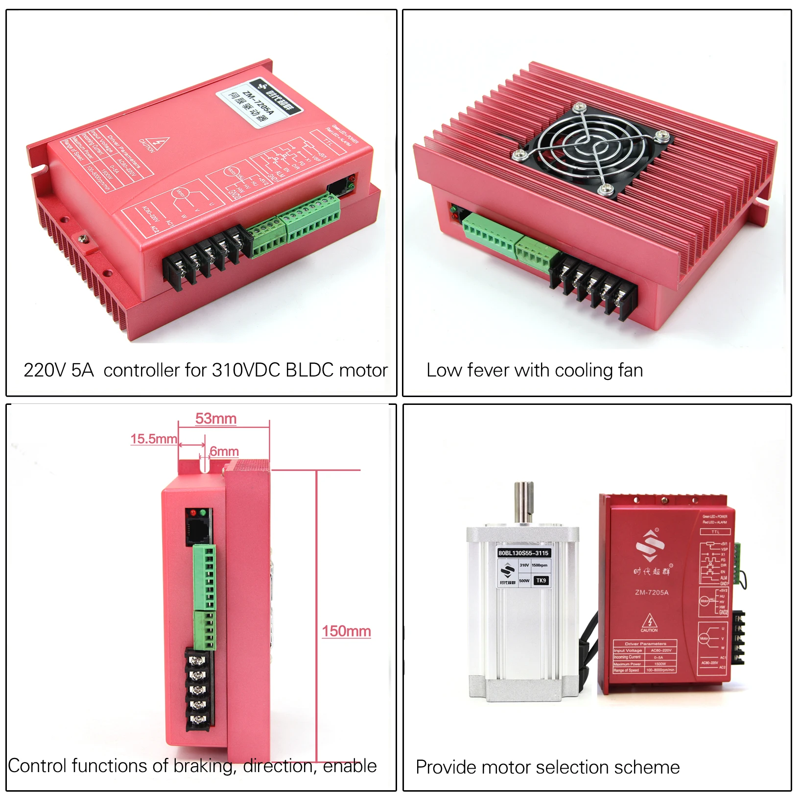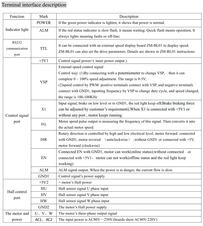 This controller is the latest high-tech product of our company, for the field of medium power motor drive. It uses a large-scale integrated circuit to replace the original hardware, so it has higher performance of anti-jamming and fast response ability. It is suitable for all the low voltage three-phase brushless DC motors with peak current below 5A and low voltage AC80V-250V(boards show AC80V-220V) ,whether the motor driver with Hall or not. It is widely used in knitting equipment, medical equipment, food packaging machinery, electric tools and a series of electrical automation control area .