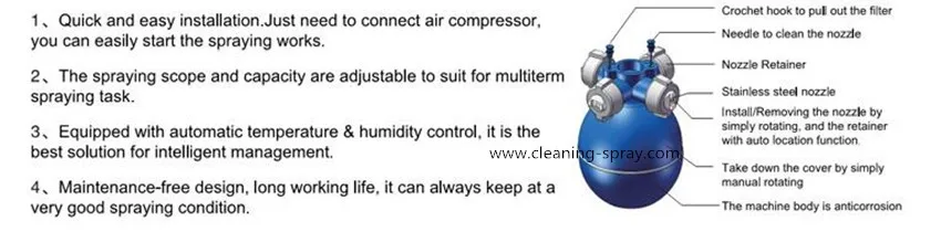 3. High-efficiency dust suppression: during spray, it can produce a large number of negative oxygen ions which will neutralize positive charges so as to absorb and gather the dust particles and then drop down.