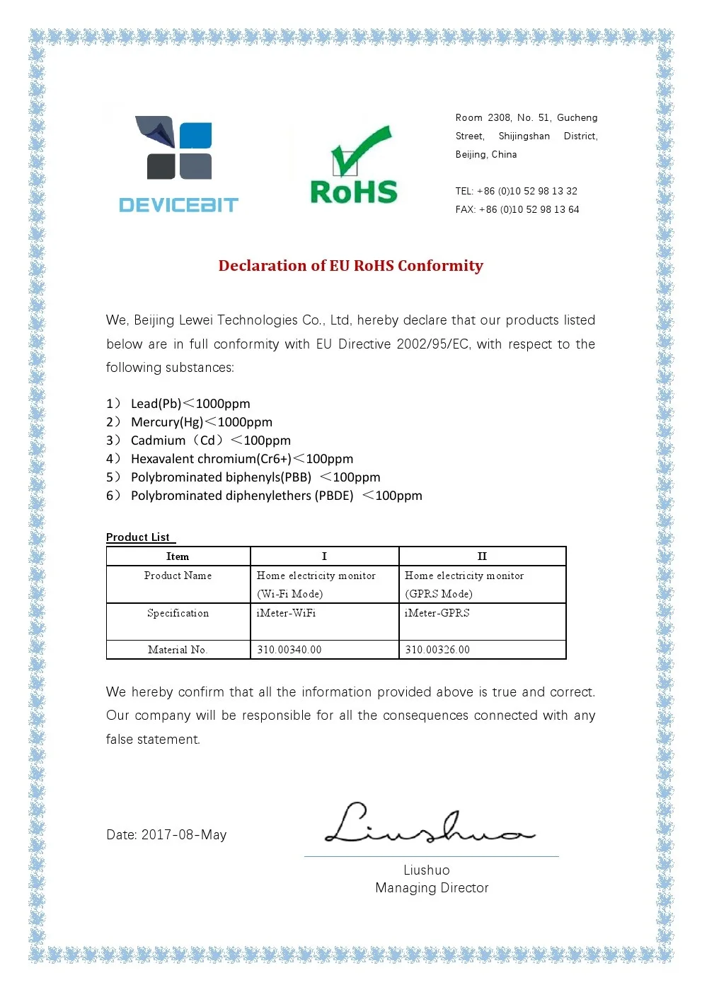 CE Certificate RoHS Declaration