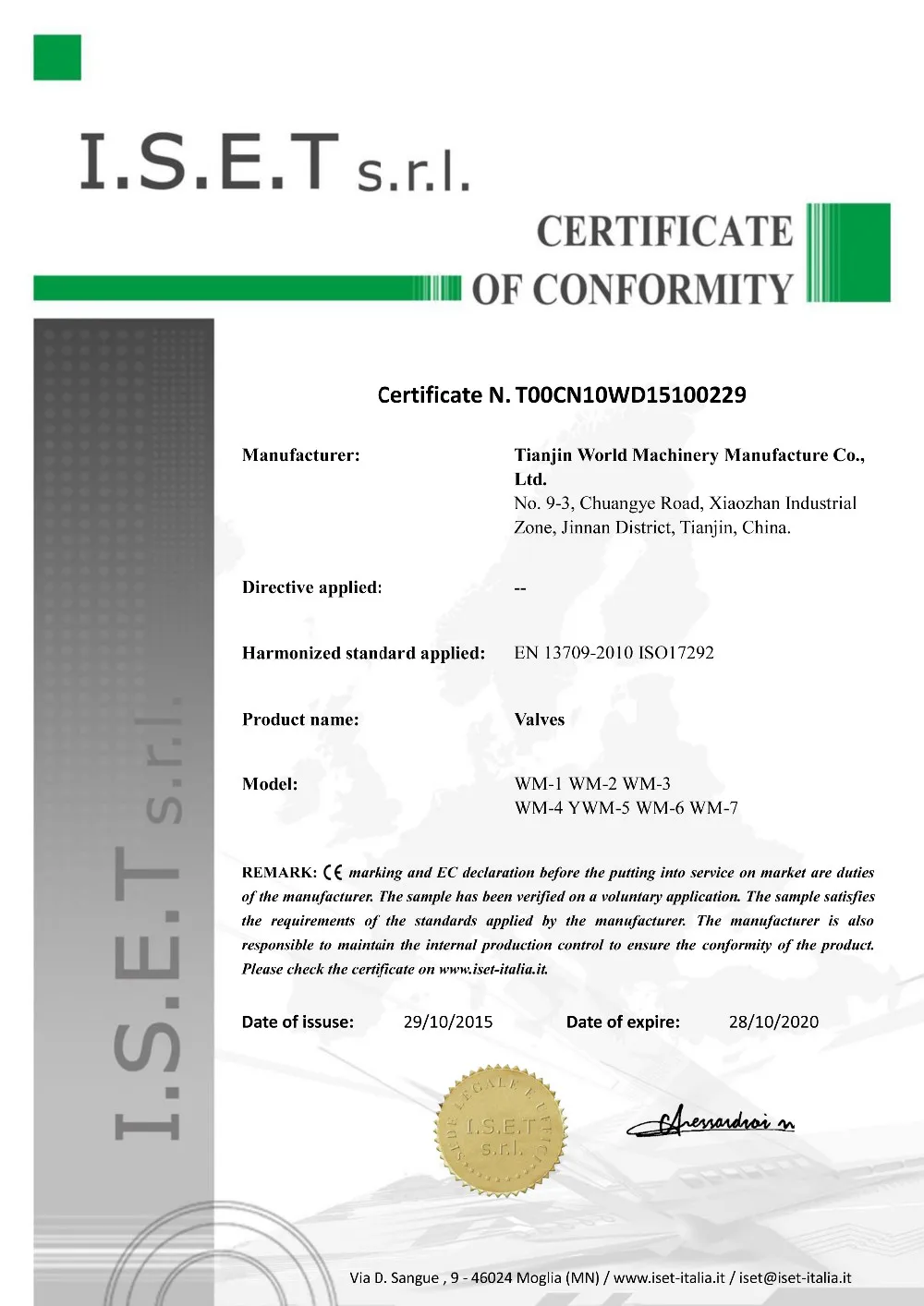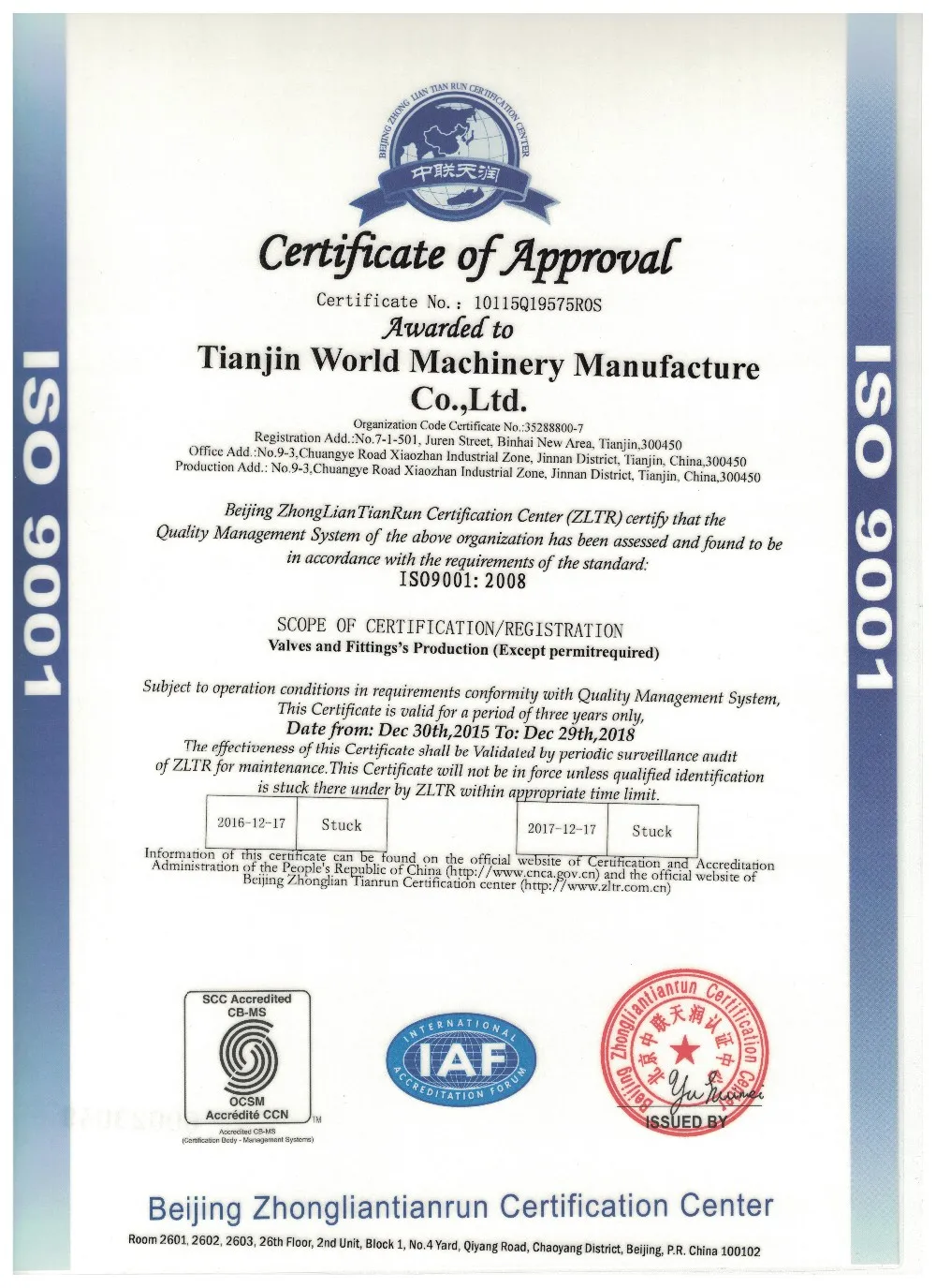 Tianjin World Machinery Manufacture Co., Ltd was established in 2002. We are a valve manufacturer located in Jinnan District, Tianjin. We provide R&D, manufacture, sales and service. Compared with other manufacturers, our products are very competitive in prices and quality, because we do casting, parts machining and painting all by ourselves, so we could control quality better and save a lot cost.Welcome to visit us!
