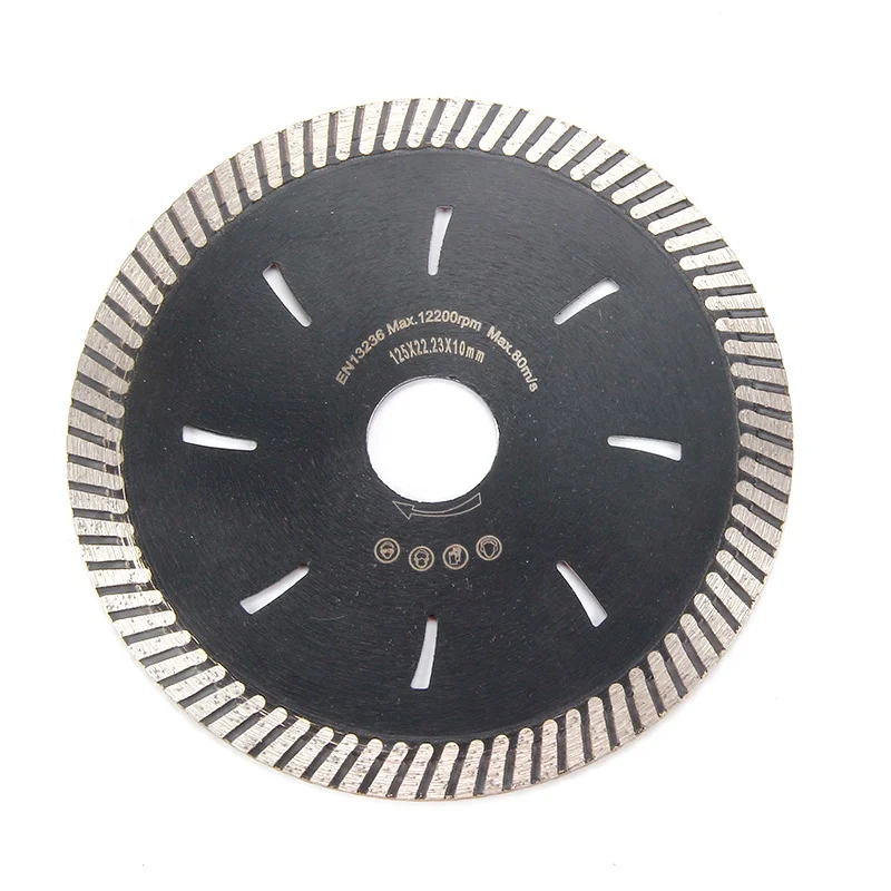 TURBO DIAMOND BLADE - Continuous Turbo Rim Design ideal for cutting Masonry Work, Concrete, Stone, Brick, Block, and Similar Materials. Cooling holes help to keep the blade cool for increase tool life