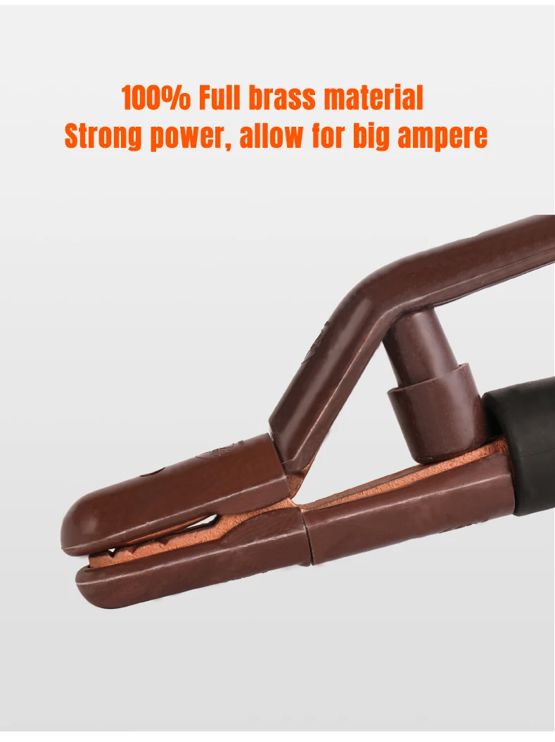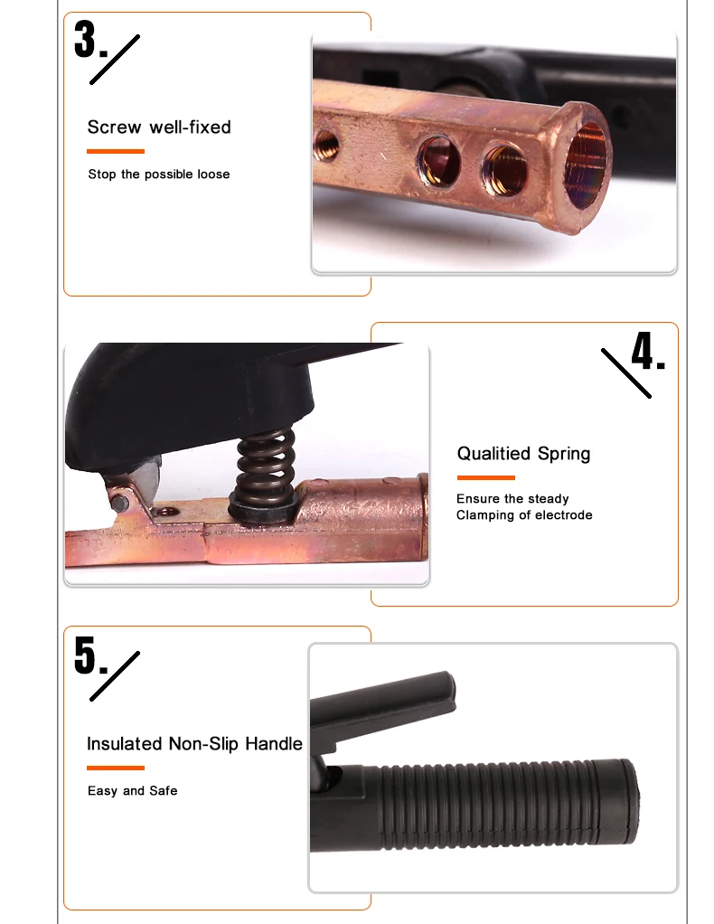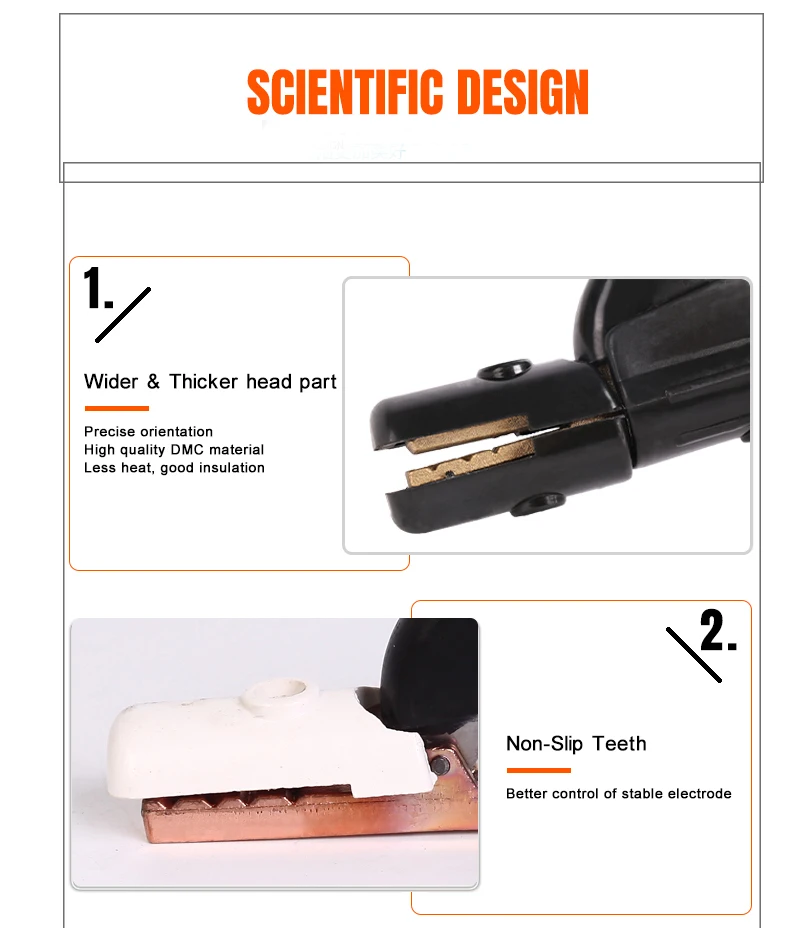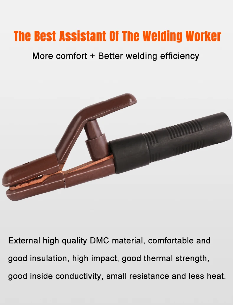 The high temperature / high impact-resistant molded fiberglass fully insulated body to protect against electrical shock and have powerful spring loaded non-slip insulated clamping jaws to hold the electrode tightly so it will not slip while welding.