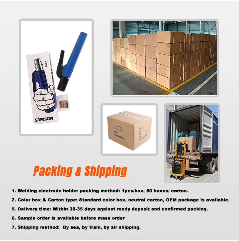 | Product name: | Welding Electrode Holder; | Packaging Detail: | 1. Welding electrode holder packing method: 1pcs/box, 50 boxes/ carton. 2. Color box & Carton type: Standard color box, neutral carton, OEM package is available.; |