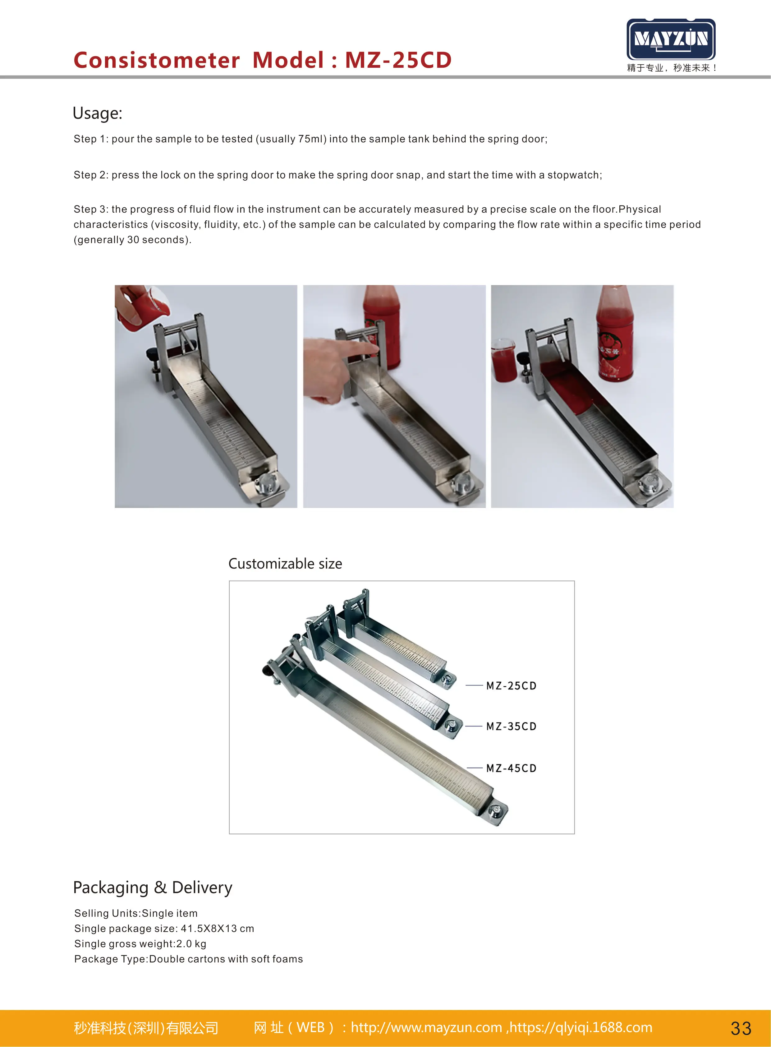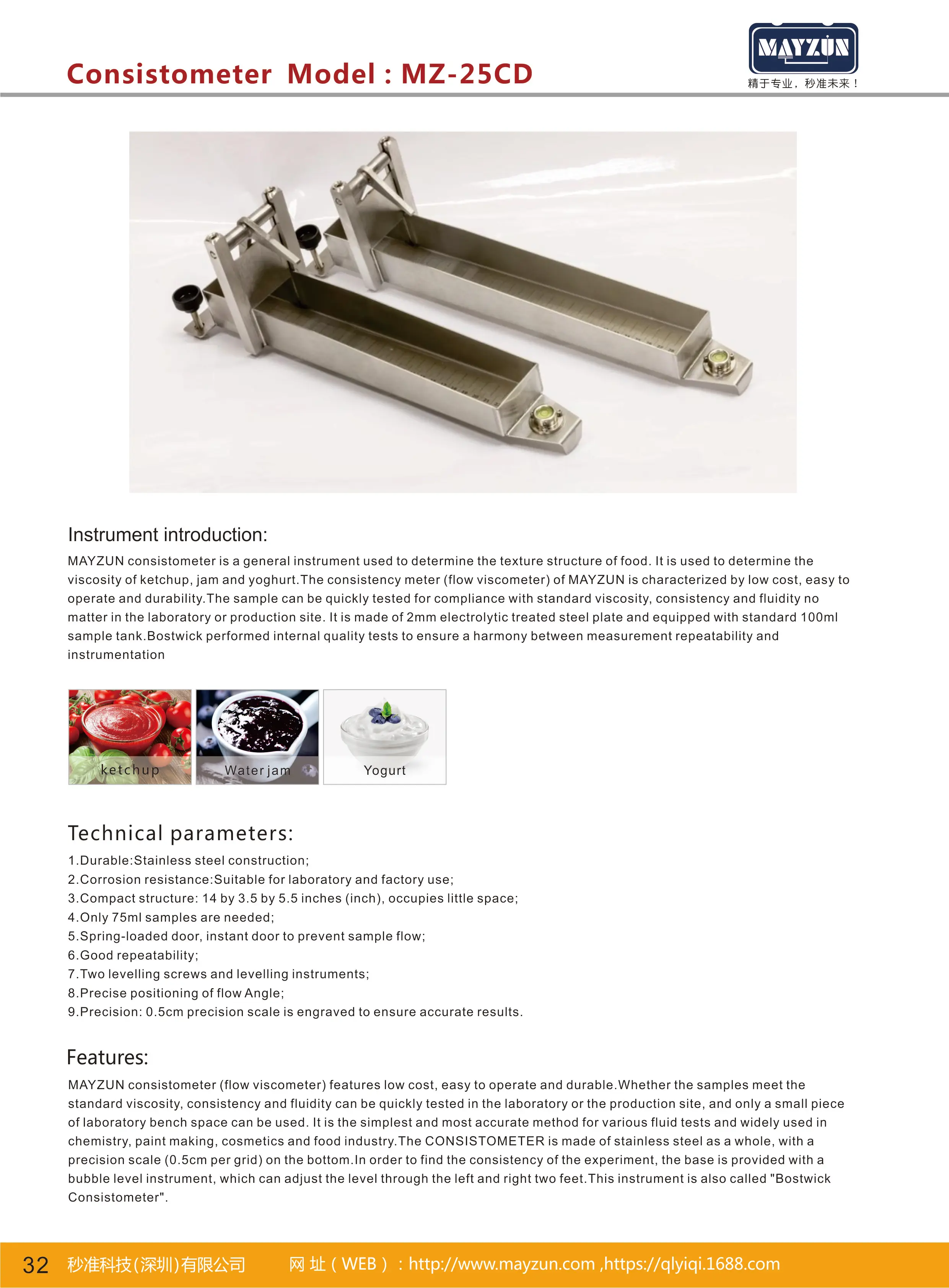 MAYZUN consistometer (flow viscometer) features low cost, easy to operate and durable.Whether the samples meet the standard viscosity, consistency and fluidity can be quickly tested in the laboratory or the production site, and only a small piece of laboratory bench space can be used. It is the simplest and most accurate method for various fluid tests and widely used in chemistry, paint making, cosmetics and food industry.The CONSISTOMETER is made of stainless steel as a whole, with a precision scale (0.5cm per grid) on the bottom.In order to find the consistency of the experiment, the base is provided with a bubble level instrument, which can adjust the level through the left and right two feet.This instrument is also called "Bostwick Consistometer".