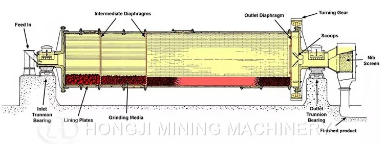 The ball mill is a horizontal rotating device transmitted by the outer gear. The materials are transferred to the grinding chamber through the quill shaft uniformly. There are ladder liner and ripple liner and different specifications of steel balls in the chamber. The centrifugal force caused by rotation of barrel brings the steel balls to a certain height and impact and grind the materials. The ground materials are discharged through the discharging board thus the grinding process is finished.