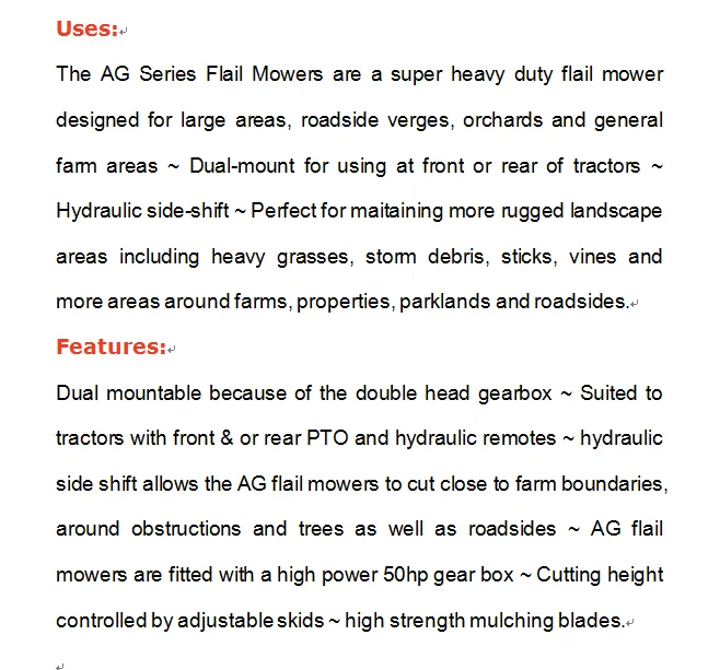 Developing a wide range of products for gardening or farming maintenance. More than 60 serials and 400 models of various implements. Such as: Flail mower, Rotary tiller, Front end loader, Backhoe, Wood chipper etc. Adapted to a variety of horsepower tractors.Flexibility and attention to customers' requests and feedback. To satisfy every customer’s needs to the greatest extent.With ISO9001 and CE certification. Providing a well technical support and sales support with accessories. To present you a better farming life.