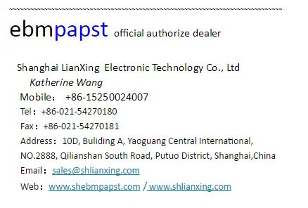 Shanghai LianXing Electronic Technology Co., Ltd is ebmpapst’s official authorize dealer,located in 10D, Buliding A, Yaoguang Central International,NO.2888, Qilianshan South Road, Putuo District, Shanghai,China.Company was founded in March 2004,ebm-papst Ventilator (Shanghai) Co., Ltd was founded in September 1996,so LianXing has long history business experience of ebmpapst fan including ebmpapst axial fan,ebmpapst outer rotor fan,ebmpapst centrifugal fan,ebmpapst compact fan,ebmpapst tangential blower fan,ebmpapst gas blower fan,ebmpapst Hot air blower.We achieve ebmpapst’s more support in cost,technical ,delivery and something else more depends on our abundant experience and mature technical backup.