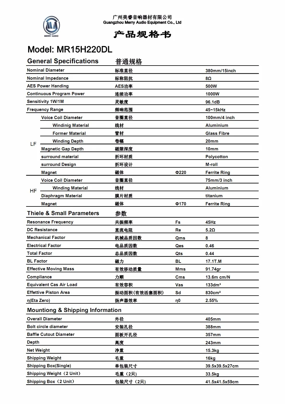 | frequency: | 45~15kHz; | Model Number: | MR15H220DL; |