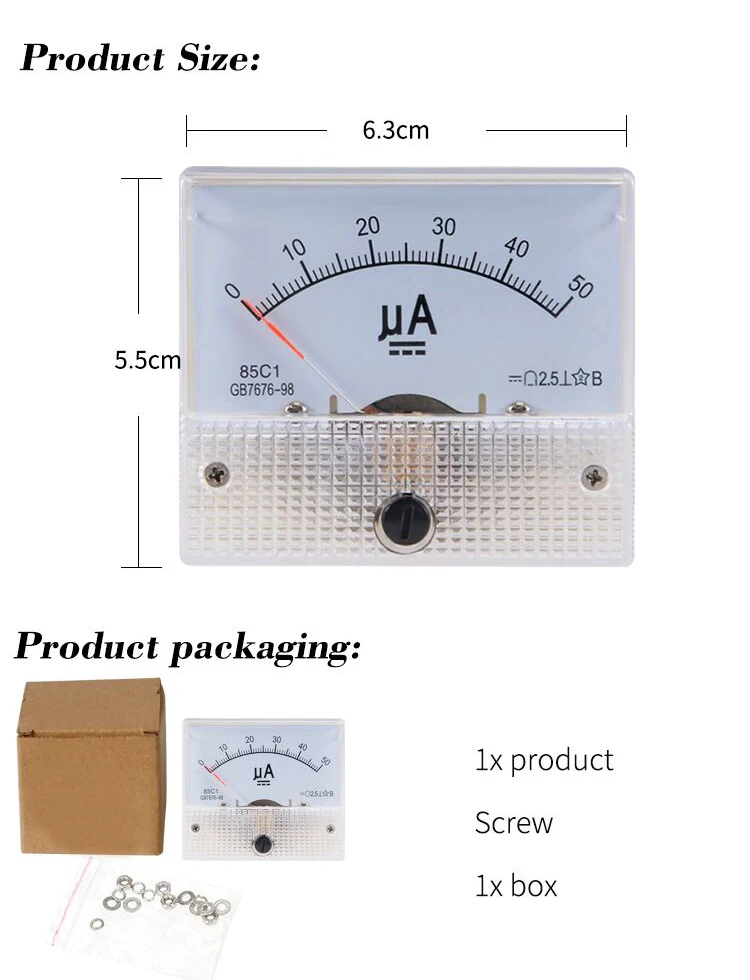 | Product Name: | Pointer ammeter; | Packaging Detail: | Single package size:6.5*6*6.5cm Single package weight:68.5g Packaging material:Carton; |