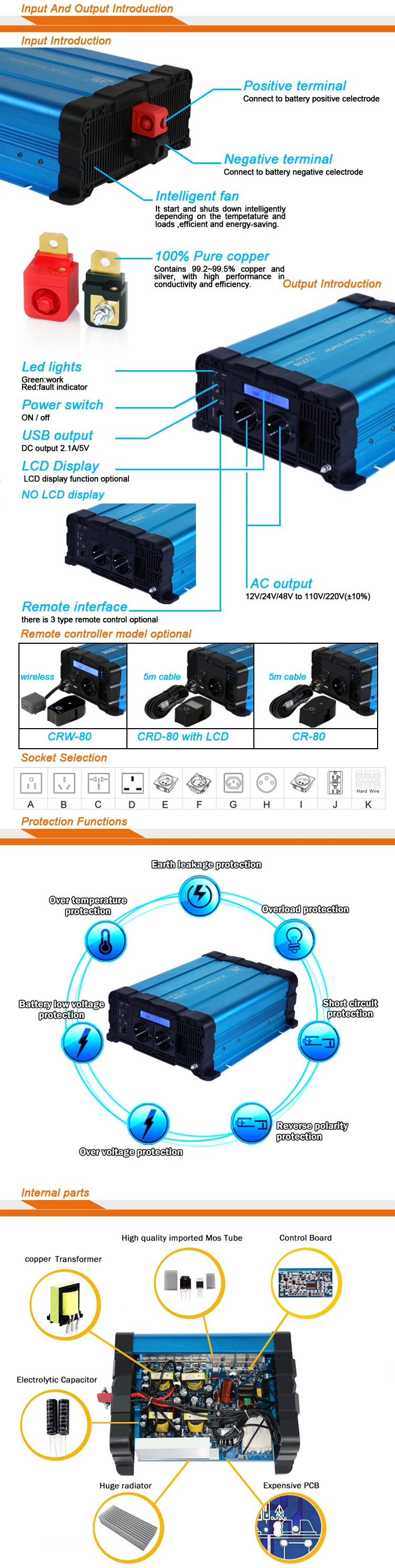 | LCD display | voltage, power, protection status(optional) | ||||||
