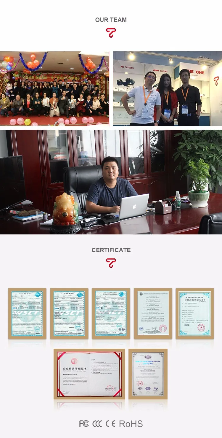 Shenzhen TOPSKY Digital Technology Co.,ltd was setablished in March 2011. We mainly engaged in R&D, production and sale of 3D video glasses, smart glasses, and FPV glasses. The factory covers an area of 2500square meters. There are over 200 staff, three production lines and two clean rooms. Annual production value of over hundred million.
