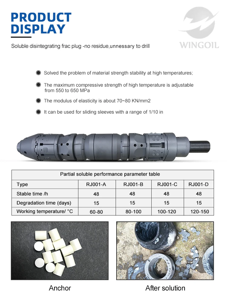 Model: WY-453 No need to drill after fracturing, No residue, Full-bore production flow path 1. Self-made multi-strength soluble metal manufacturing, dissolution time on demand transformation. The main body of our company's soluble bridge plugs is made of self-developed multi-strength soluble magnesium metal composite. After the core material composite application, the dissolution time of the whole machine is completely consistent, no residue, no toxicity, according to the on-site water quality and work. It is necessary to adjust the formula at any time to change the unique advantage of dissolution time.