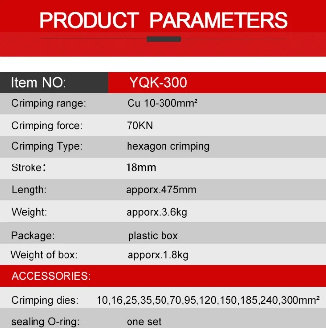 | crimping type: | hexagon crimping; | Crimping Capacity: | Max.300mm2; |