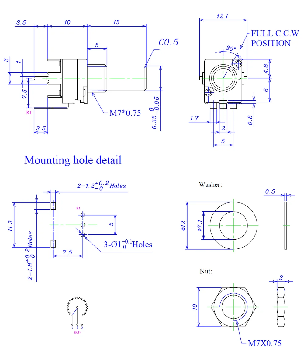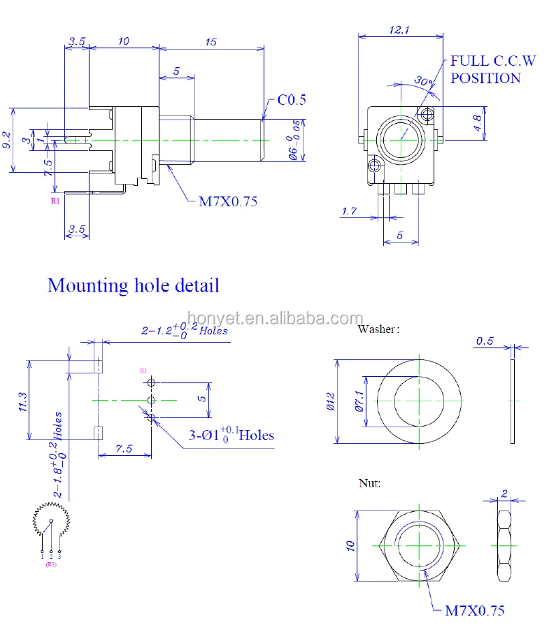 | Resistance: | A1M,B100K,B10K; | Resistance Tolerance: | 20% / 10%; |