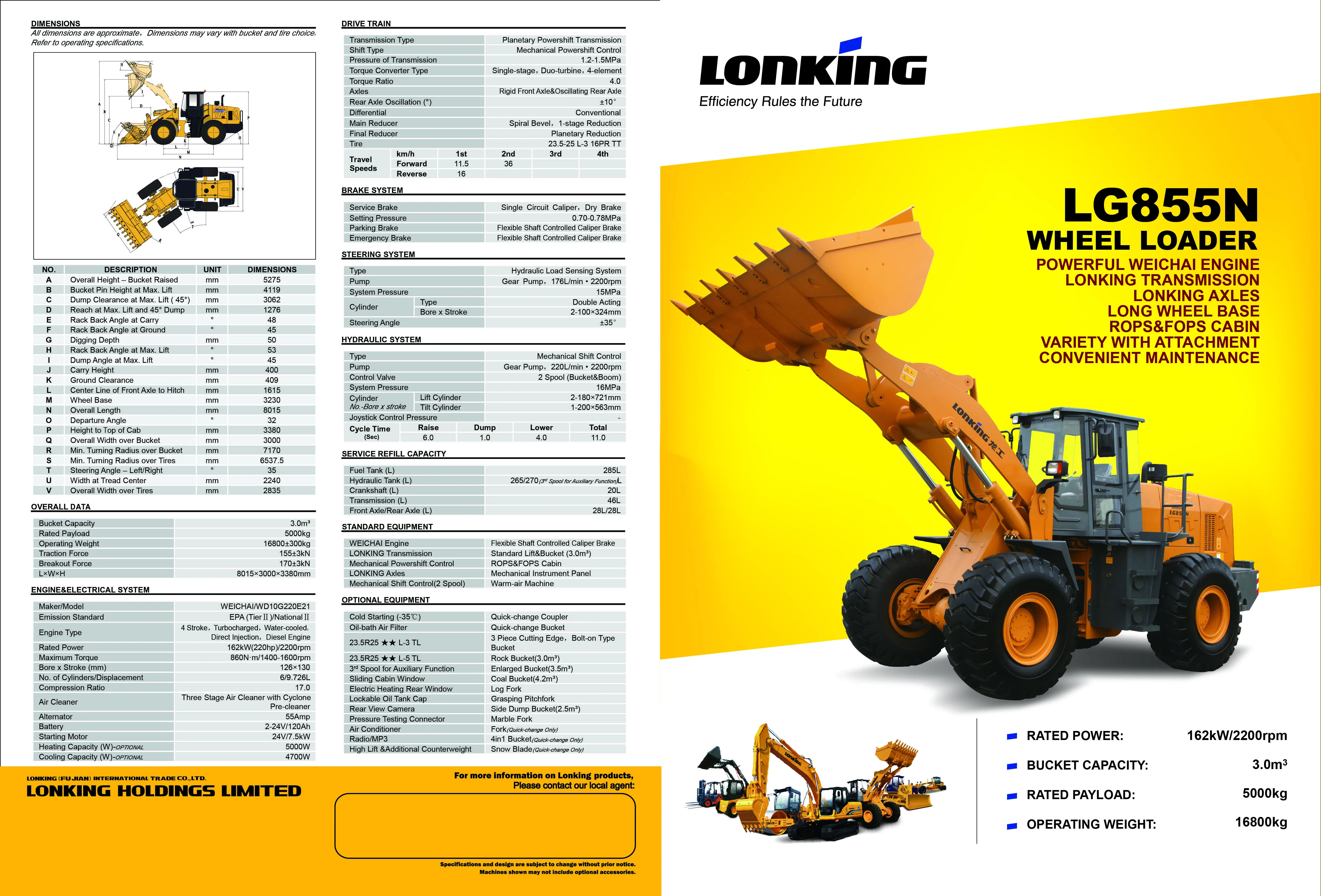 LG862NEnvironmental protection, strong new power, reliable transmission weichai guo three emission engine, air-air cooling, four valve structure, low noise, full combustion, power efficiency (strong).Using ECU (electronic control unit), the engine has good performance, economy and emission.The engine and double transformer assembly are supported by frame, which can reduce the front gear failure rate by 80%.Equipped with longgong homemade 6 ton gearbox, drive axle, equipped with imported bearing transmission efficiency, reliability is stronger.