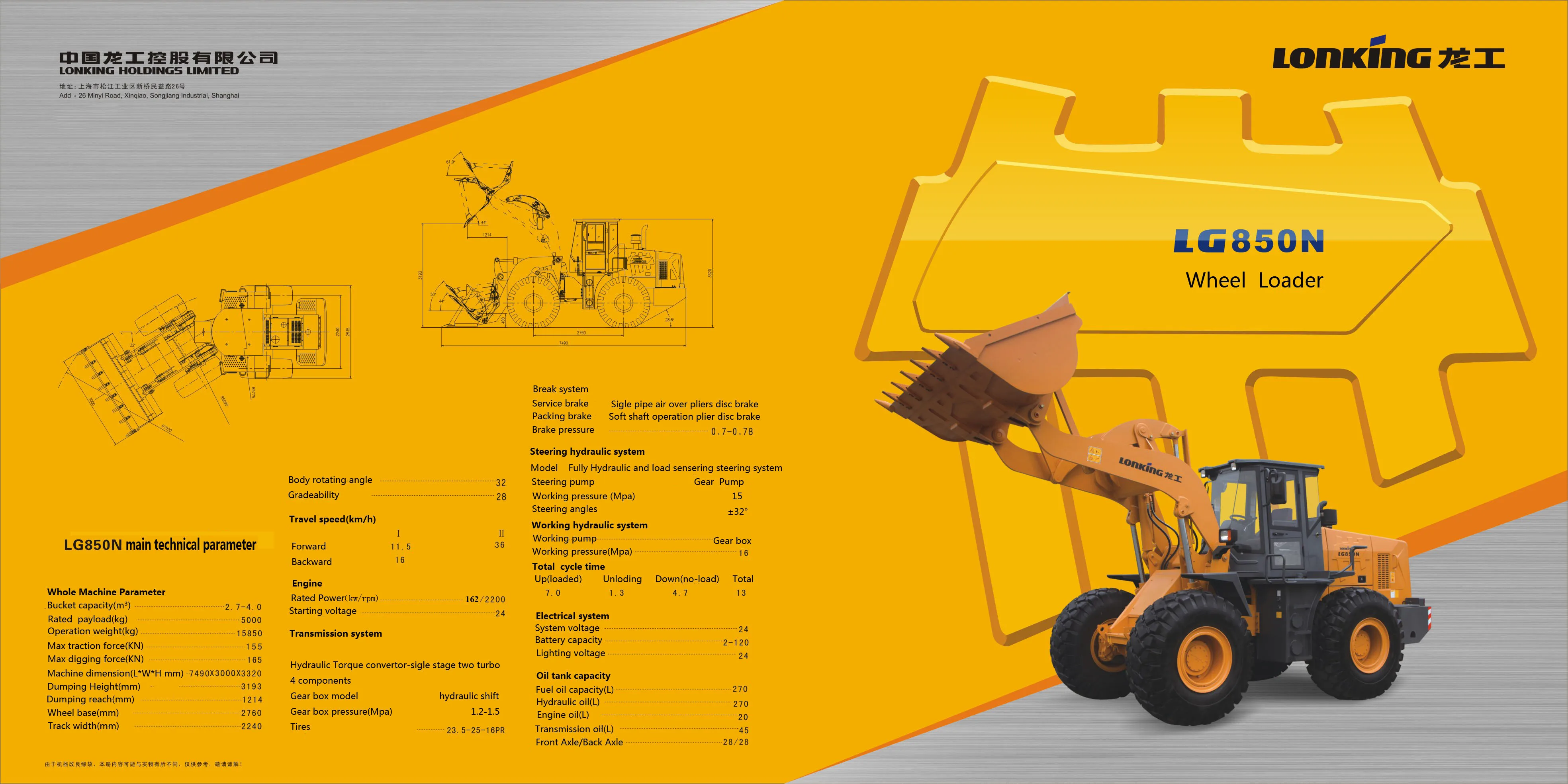 LG850N Weichai guo-3 emission powerful new power, reliable transmission weichai guo-3 emission engine, air-air cooling, four-valve structure, low noise, full combustion, power efficiency.Using ECU electronic control components, engine performance, economy and emissions of good technical indicators.The engine assembly USES frame support to reduce front-end wheel failure by 80%.Equipped with longgong homemade classic planetary gearbox, homemade drive axle, reinforced transmission shaft, high transmission efficiency, reliable work.Ergonomic design for comfort and safety.