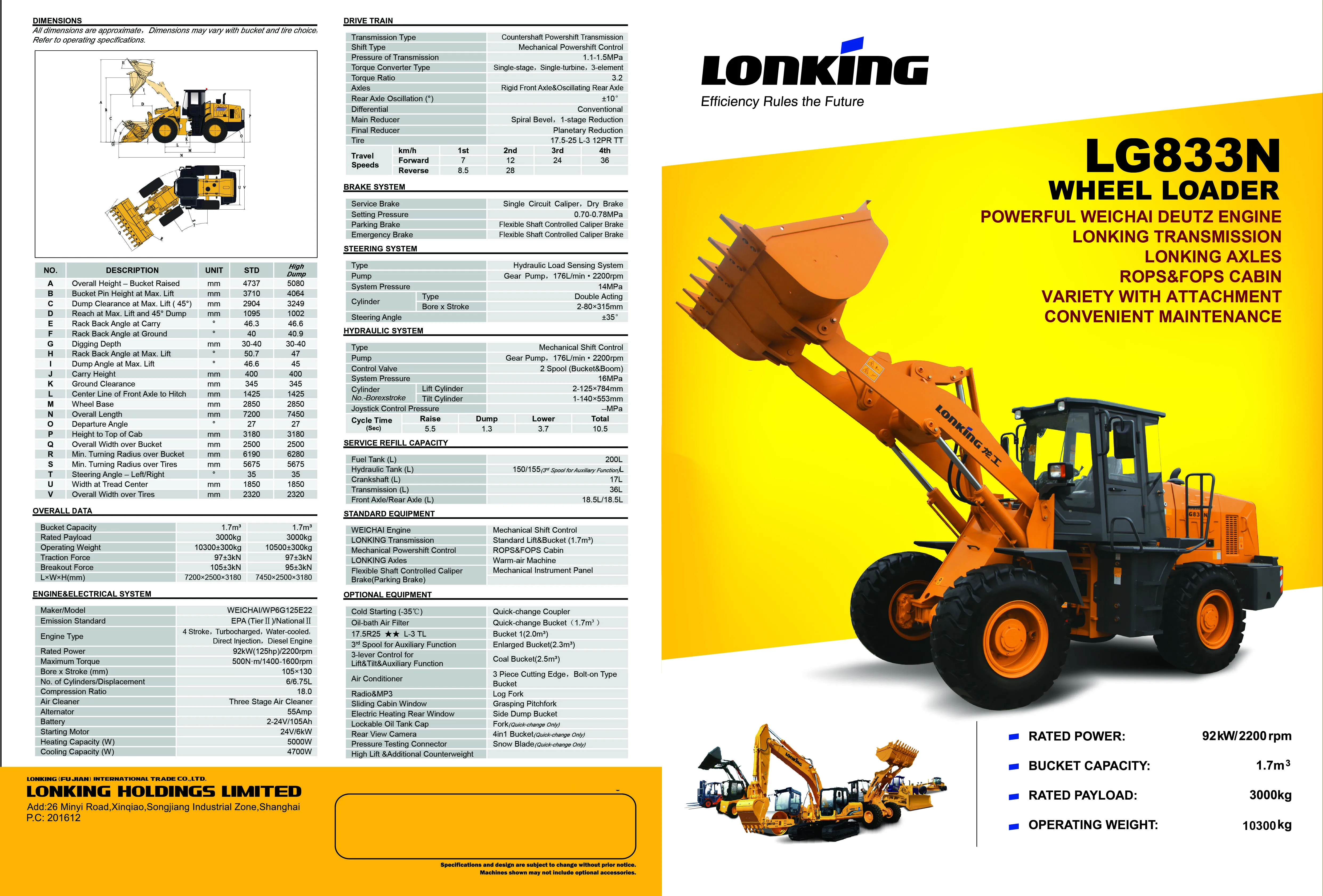 LG833Nhigh discharge king (national iii) environmental protection, strong new power, reliable transmission equipped with daoitz high pressure common rail electric injection engine, low noise, green environmental protection, power efficiency.Comply with national emission regulations, engine performance, economy and emissions of good technical indicators.The engine assembly USES frame support to reduce front-end wheel failure by 80%.Equipped with longgong hydraulic shift fixed shaft gearbox, high transmission efficiency, reliable work.Dragon - made drive axle, high reliability, strong adaptability to heavy load.Ergonomic design for comfort and safety.