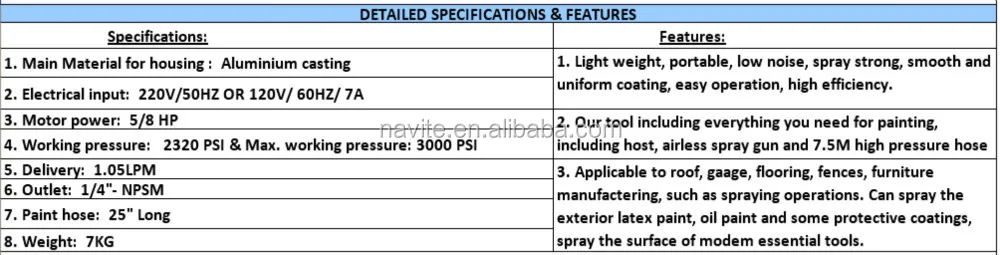 | Port: | FOB NINGBO; | Packaging Detail: | Manufacturer of 5/8HP Piston DIY airless paint sprayer NA-420F ONE SET PER CARTON BOX CARTON SIZE: 31.5X31.5X39CM; |