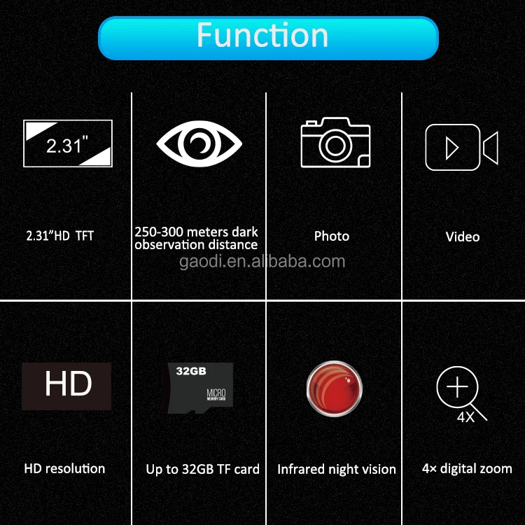 | Memory card: | Up to 32GB; | Viewing distance: | 250-300m; |