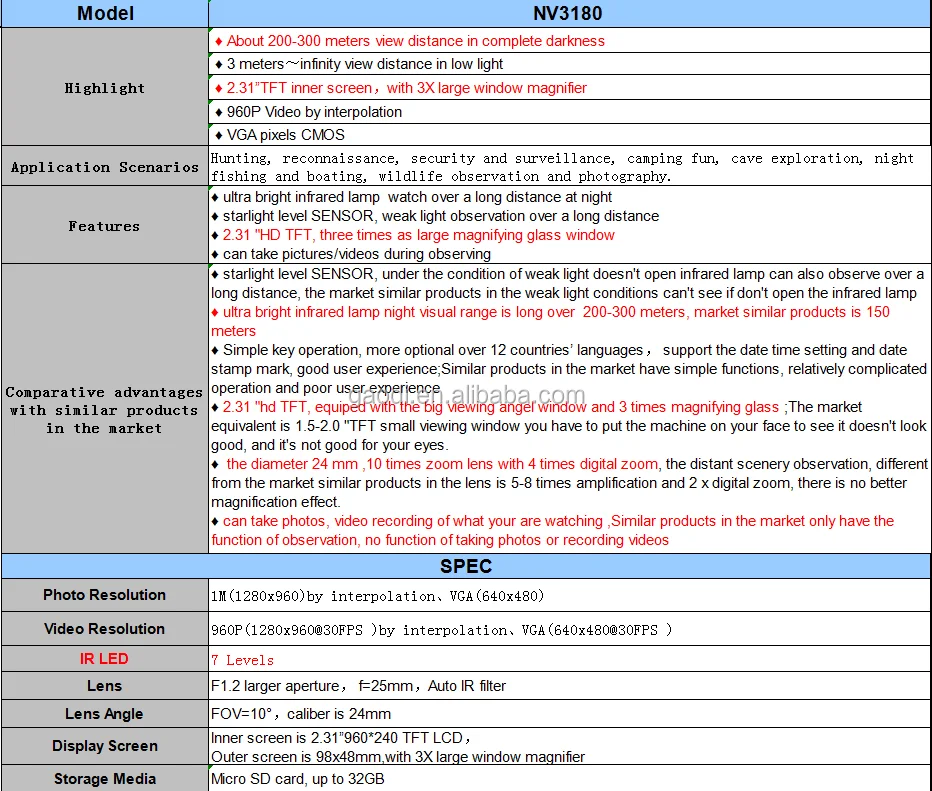 | Model Number: | NV3180-xb; | IR LED: | 3W, 850nm, 7 levels of adjustment; |