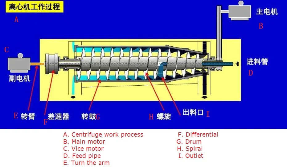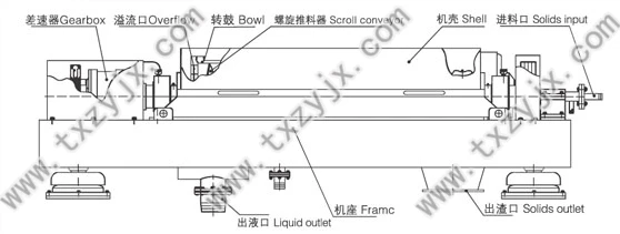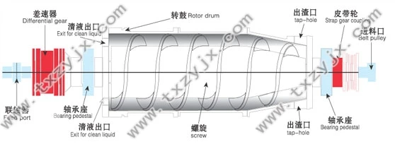 Separated liquid through the feed inlet into the high-speed rotation of the drum, under the action of the centrifugal force, the suspension in the drum to form a circular flow, the solid particles in the centrifugal force rapidly settling to the inner wall of the drum by Differential and the differential rotation of the drum from the screw conveyor, the screw conveyor to promote the sediment to the drum cone end of the drying zone, after the screw conveyor and sediment centrifugal reasoning bi-directional squeeze, so that the sediment is further squeezed Pressure dehydration, discharge from the small end of the drum slag discharge port. The separated light liquid is discharged through the overflow port.