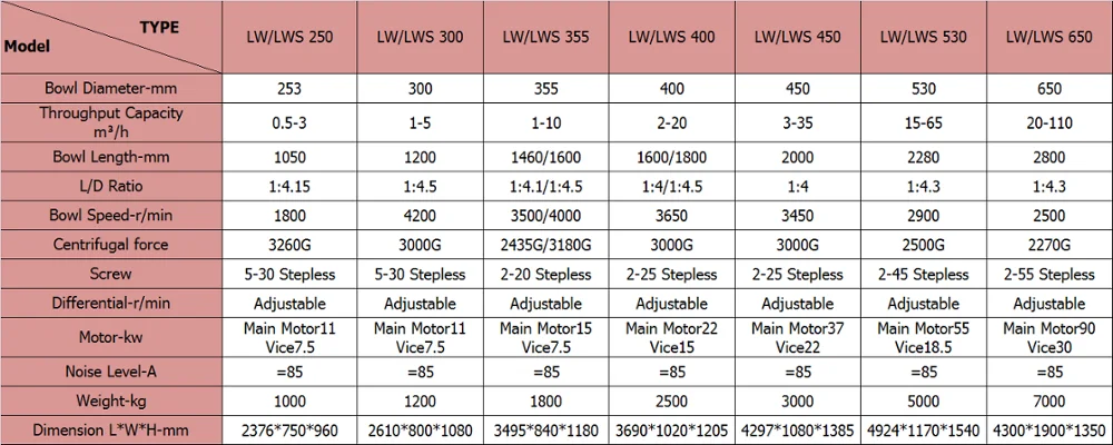 The centrifuges we produce can clarify, dehydrate or fractionate suspensions containing solid-phase particles in the 0.002-3 mm range. Products according to the structural characteristics of sub-LWB and flow, LW counter-flow, LWS three-phase classification of three types and series, can be adapted to different materials in different conditions of separation.