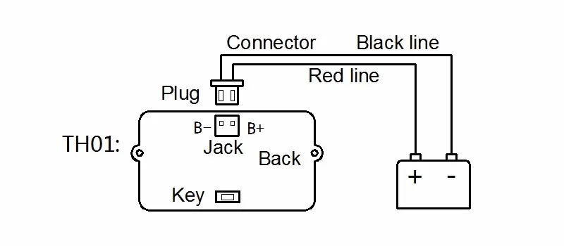 TH01 battery monitor provides a connector consists of plug, black line and red line. Connect the black line to the negative, the red line to the positive, the plug to the socket of monitor. Then, power on or turn on the switch, it will be work. As shown below: