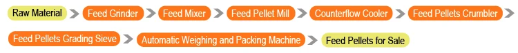 Raw Material → Feed Grinding → Feed Mixing → Feed Pelletizing → Pellet Cooling → Pellet Crushing → Screening & Grading → Pellet Packing