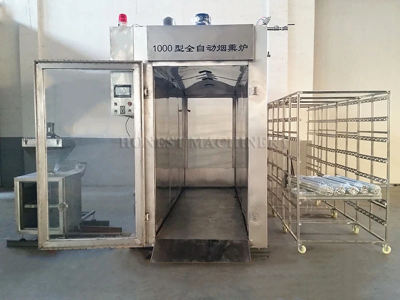 Meat Smoking machine has the functions of cooking, drying, baking, smoked, color and other .Smoked refers to the corresponding wood is not completely burned to produce volatile substances for smoked the process. The purpose of smoked meat products is to make the meat product dehydrated, giving the product a special fragrance. It has the characteristics of low energy consumption, high output, easy cleaning, adiabatic and sealing performance, fast heating, smoked fragrance, automatic temperature control and timing control. This product is a meat processing enterprise and individual processed meat (ham, Smoked chickens, smoked ducks, smoked goose, smoked fish, etc.) must be set up.