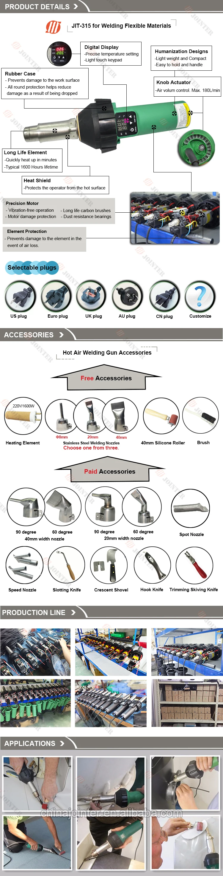 JIT-315 hot air welding gun is a fantastic hand tool that can be used in a variety of applications uncluding forming, bending and coupling of thermoplastic components, plastic fabrication, roof membrane welding, vehicle fairing reapirs, shrinking and drying etc.