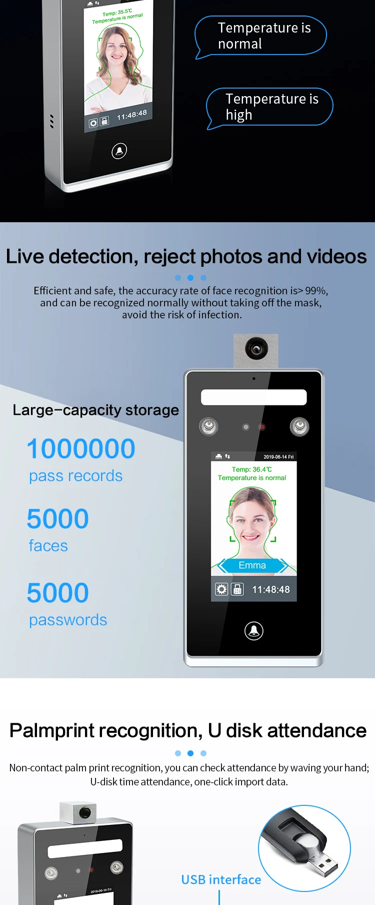 | 3. Large-capacity storage: 1,000,000 pass records, 5000 faces, 5000 passwords, 5000 cards (optional); | |